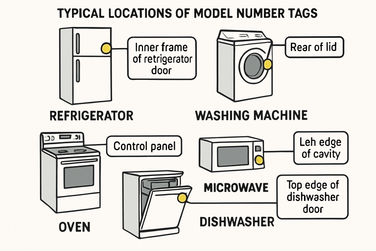 Each type of appliance may use a different labeling scheme or location for the model number. Knowing your appliance’s style can help you pinpoint the right spot quickly: